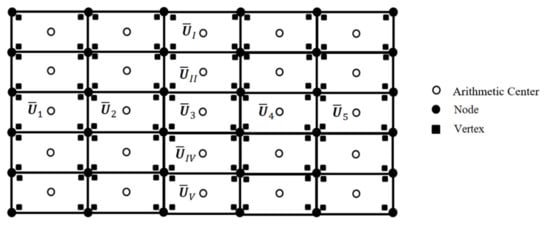 Although the slope limiter can be applied to general linear quadrilateral elements, a discretization using linear rectangular elements is shown in Figure 1. The element average solution is situated at the arithmetic average of the vertices (arithmetic center), as seen in Figure 1. The squares in the figure are the element nodal values located at the vertex of a rectangular element. The smoothing of is achieved by the application of a dissipative interface. A usual dissipative interface, like the one presented by Abbot & Basco [] in a finite difference context, applied to the center value in Figure 1, would be: