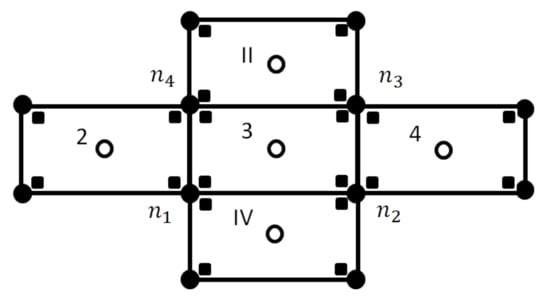 In Equation (32), is the limited value at the boundary between elements 3 and IV. The inverse distance weighting with and is used to find at the boundary. A similar process is adopted to calculate , and . Finally, the nodal values of the limited conservative variables can be reconstructed over a quadrilateral element e by evaluating Equation (33) at the four nodes. In Equation (33) is a vector with origin at the arithmetic center of the element extending to any point within the element. The vector for the node 1 at Figure 2 will be , , where are the values at the arithmetic center of the element. This reconstruction implies that the reconstructed variables will have a constant gradient over the element. The limiter is applied after every step of the Runge–Kutta integration in Equation (25).