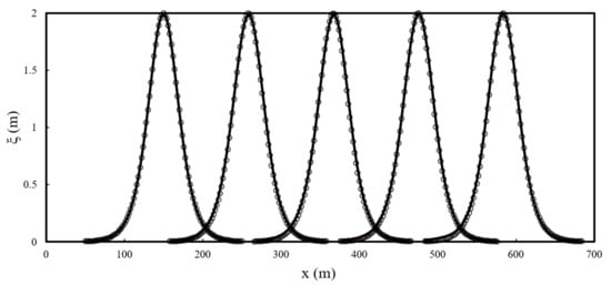 In this study, we considered a frictionless channel 800 m long and water depth of 10 m. A Sommerfeld boundary condition based on the elevation of the water surface is specified at the entrance and exit of the channel. The solitary wave is initially at = 150 m, with a wave height = 2 m. The mesh is made by square elements of sizes Δx = Δy = 1 m. Analytical solutions of free water surface elevation and velocity are given by: