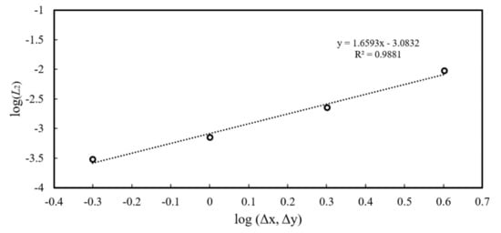 To assess the accuracy of the model, four different meshes of square elements with sizes ∆x = Δy = 0.5 m, 1.0 m, 2.0 m and 4.0 m are considered. In Figure 4, the error norms are shown for evaluated at t = 40 s as a function of grid size ∆x, Δy, defined as: