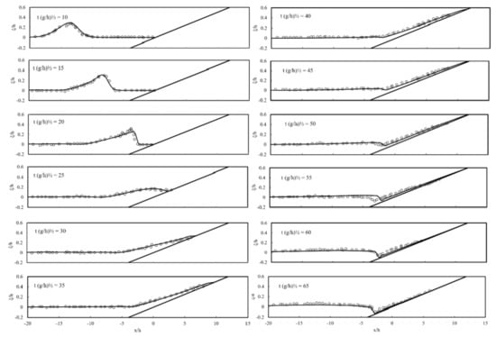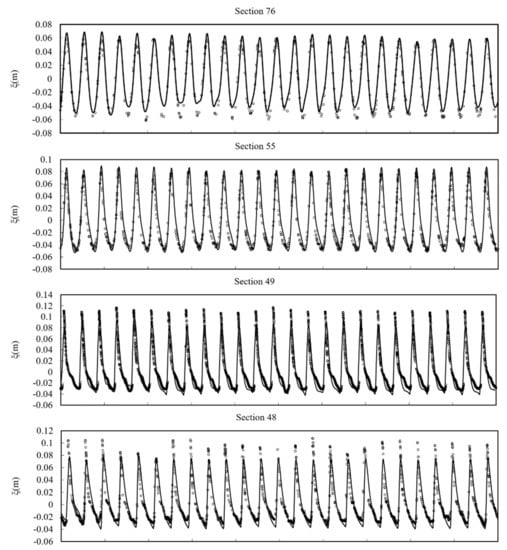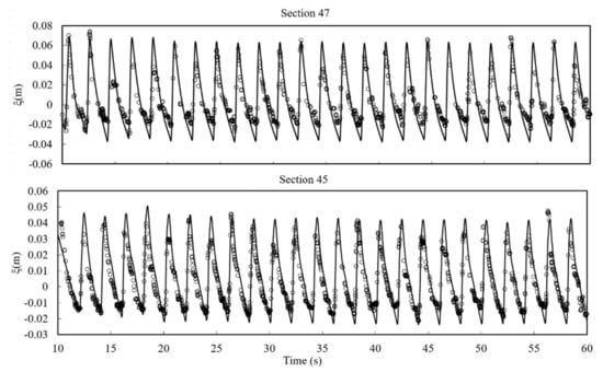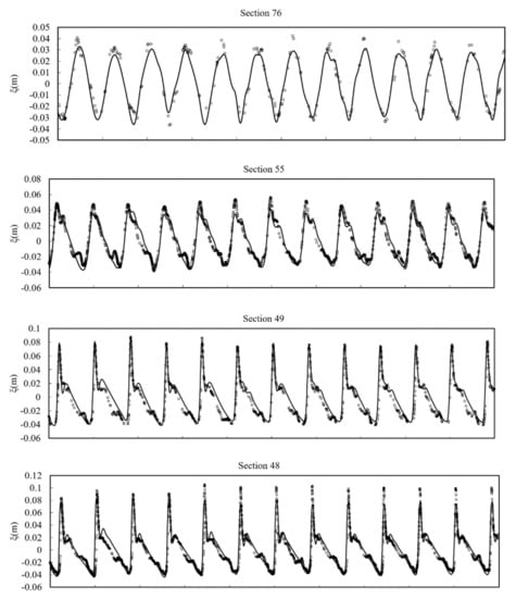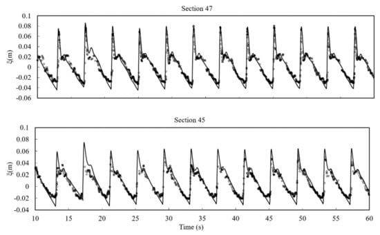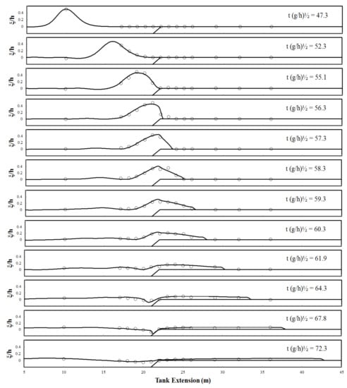 Figure 5 shows the comparison of simulated and measured profiles. As the wave propagates over the inclined beach, the front of the wave begins to incline. Laboratory data show that the breaking of waves occurs between = 20 and 25. The broken waves run up to the beach until the maximum height of around = 45. It is seen that the wave breaking and runup processes are simulated very well. When the wave retreats from the beach, a hydraulic jump is formed and major discrepancy between simulated results and measured data is observed at = 55. This phenomenon may be attributed to the complex vertical flow structure that cannot be captured by the depth-integrated formulation [,]. After this point, good agreements are reached until the end of the retreat process.