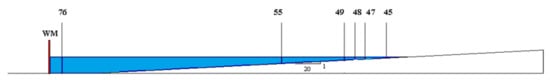 Table 1 shows the main parameters of the examined waves listed for each experiment, such as the offshore wave height, , the wave period T and the deepwater wavelength, , estimated in section 76 (Figure 7), where the bottom is flat and the mean water depth, h, is equal to 0.70 m. Moreover, to evaluate the type of breaking, the Irribarren number, , was computed for the two tests, as: