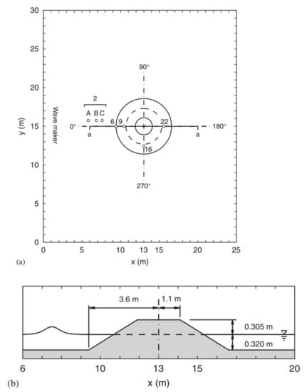 A large-scale laboratory experiment to study solitary wave runup on a conical island was conducted by Briggs et al. []. The experiment was conducted in a 30 m wide and 25 m long basin (Figure 10). The center of the island is located at x = 13 m and y = 15 m, and the shape of the island is a truncated circular cone with diameters of 7.2 m at the toe and 2.2 m at the crest. The vertical height of the island is about 62.5 cm, with a 1:4 beach face. A 27.4 m long directional spectral wave maker, which consisted of 61 paddles, generated solitary waves for the experiment. Wave absorbers at the three sidewalls reduced reflection. Different still water depths and relative wave heights were tested in the experiment. In this study we consider the still water depth h = 32 cm and three cases denoted as I, II, and III with relative wave heights A/h = 0.045, 0.096, and 0.181, respectively.
