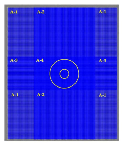 In the numerical simulation, the solitary wave propagates from the western boundary toward the island. Sommerfield radiation boundary conditions are applied at the western and eastern boundaries and the lateral walls are treated as solid walls. The basin is discretized using a total of 146,640 elements: square elements with sizes Δx = Δy = 0.1 m (A-1), rectangular elements with sizes Δx = 0.05 m and Δy = 0.1 (A-2), rectangular elements with sizes Δx = 0.1 m and Δy = 0.05 (A-3), and square elements with sizes Δx = 0.05 m and Δy = 0.05 m (A-4) near the conical island, as shown in Figure 11. The combination of rectangular and square elements reduced the number of elements/cells by 50% compared to the application of other models to the same problem, e.g., Wu et al. []. A Manning coefficient n = 0.01 is used for the bed surface roughness.
