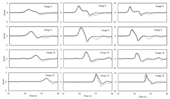 Figure 12 shows the comparison of simulated and measured free surface elevations at selected wave gauges for all three cases. For all cases, good agreements between numerical results and measurements are obtained in gauges 6, 9 and 16, whereas in gauge 22 overall agreements are acceptable, although the numerical model slightly overpredicts the wave depression in cases I and II.