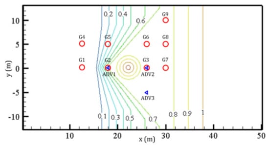 Bathymetry contours and locations of measuring points. Circles (water surface measurement gauges), triangles (acoustic Doppler velocimeters) (from: Wu et al. []).