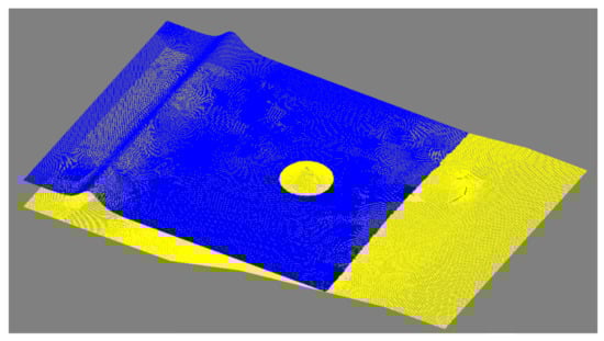The first condition is usually active in correspondence of moving waves. The second condition acts in a complementary manner and allows to detect stationary or slow-moving hydraulic jumps []. Flagged nodes are grouped to form a breaking region. This region is either enlarged to account for the typical roller length, as suggested in Tissier et al. [] and Kazolea et al. [], or deactivated, depending on the value of the Froude number at breaking, , defined starting from the minimum and maximum wave height in the flagged zone (. All the elements containing a flagged node are switched in the element to hydrostatic mode by making , and = = . The interested reader can refer to Bacigaluppi et al. [] and references therein for more detail regarding the implementation of these detection criteria.