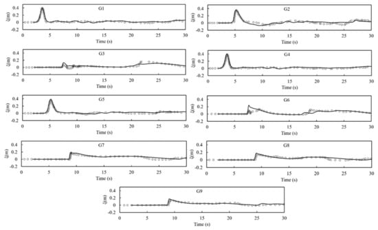 Comparison of simulated and measured free surface elevations for case T2 (plunging wave) (ɣ = 0.3, ϕ = 30°). Experimental data (circles), numerical results (solid lines).