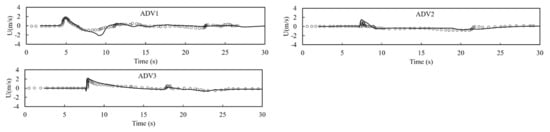Comparison of simulated and measured velocities in the x direction at the acoustic Doppler velocimeters locations. Experimental data (circles), numerical results (solid lines).