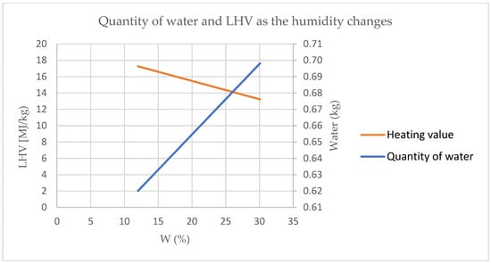 The graph shows how humidity negatively affects the heating value since a certain amount of energy must be spent on the vaporization of the absorbed water [,], while the amount of water that could be recovered increases.