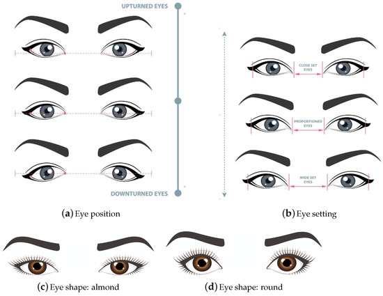 - Eye Shape: The criterion for discriminating round eye from almond eyes is that, for round eyes, the white sclera area below the iris is visible [43] as illustrated in Figure 8. Our proposed criteria exploits eye-aspect-ratio rule to determine the eye shape as follows:The threshold values for category classification are empirically chosen and estimated as follow:From Equation (8), the threshold value used to differentiate between (Almond) and (Round) labels is calculated by finding the median of subjects’ eye shape measurements. Thus, the eye shape value that is less than the median is labelled as (Almond); otherwise, it is labelled as (Round).