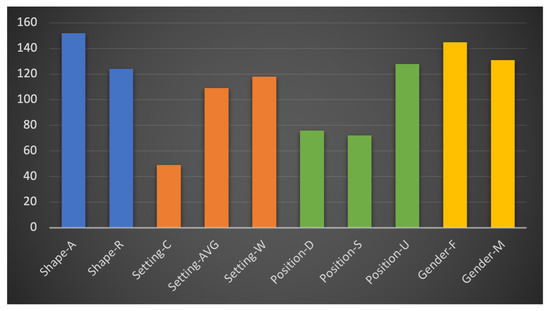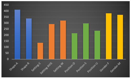 The process of determining the facial shape and eye attributes manually by beauty experts can be carried out in several stages, such as outlining the face, measuring the width and length of the face, jaw, forehead, cheekbones, the gap between eyes, and outer and inner corner of the eye. According to the beauty experts, the face shape can be recognised as five categories, namely: oval, square, round, oblong, and heart shapes [41]. The guidelines provided by beauty experts Derrick and Brooke [41,42] have been followed to label the face shape of 276 subjects into five classes. Furthermore, to provide the ground truth of eye attributes, the detailed guideline and described criteria presented in [43] has been followed by a beauty expert. The distribution of data labelled manually is depicted by exploratory data analysis in Figure 3 and Figure 4 describing the distribution of attributes over 276 subjects and per one camera, respectively.