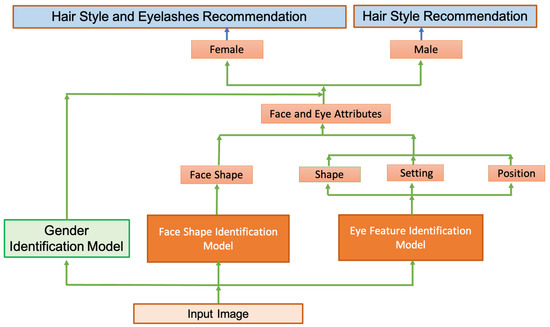 To develop a personalised and automatic approach to finding the appropriate haircut and/or eyelash style for men and women, we develop a multi-model system comprising three separate models, as shown in Figure 5. Each individual model is dedicated to achieving a specific task, including face shape identification, eye attribute identification, and gender identification. The diagram shows that the eye features extracted from an input image by the developed eye feature identification model are merged with identified face shape class. The gender of the individual in the input image is detected by the gender identification model. Thus, the face and eye attributes are combined with identified gender information. If the gender in the input image is a male, then a hairstyle recommendation for men is given; otherwise, both hairstyle and eyelashes recommendations are reported. The description of the three models are explained as follows: