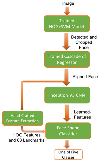 To identify the face shape, our developed model [44] that was designed by merging hand-crafted features with automatically learned features was trained and tested on data from MUCT. MUCT data has been randomly split into 3255 images for training, and 500 images was retained for testing. The developed model (shown in Figure 6) achieves the classification as follows: (1) detect the face region and crop it using a model trained on the histogram of oriented gradients (HOG) features with Support Vector Machine (SVM) model as classifier [45], (2) the detected face is aligned using the detected face landmarks (68 landmarks) by the ensemble of regression tree method (ERT) [46], and (3) Finally, the aligned images are used for training and evaluating Inception V3 convolutional neural network [47] along with hand-engineered HOG features and landmarks to classify the face into one of five classes. For further details about the face shape identification model, please refer to our developed system in [44].