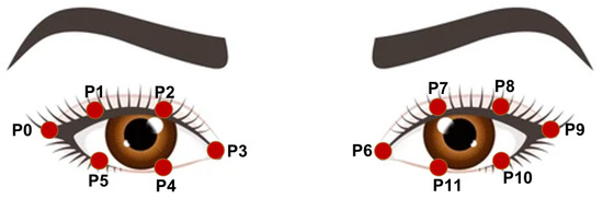The geometry of face/eye measurements based on the coordinates of detected eye landmarks are determined to develop this model. Thus, the eye specifications (shape, setting, position) are obtained. First, the face region is detected, and the landmarks of the eye region are localised using the methods presented in our face shape classification system [44,45,46]. We further customised the landmark predictor to return just the locations of the eyes using dlib library. Only six landmarks per eye—12 in two eyes—are taken into consideration for predicting eye attributes, as shown in Figure 7. Given 12 eye landmark points where , the eye specifications can be calculated using geometrical eye measurements as follows: