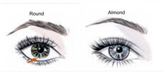 Figure 8. Round vs. almond shape. - Eye Position: Eye position categorised into up-turned, down-turned and straight can be determined using geometrical calculations by measuring the slope angle (degree). The slope angle is defined as the angle measured between a horizontal line and a slanted line (the line drawn between landmark points (, ) and (, ) for , (, ) for ). The equation of eye position identification can be defined as follows:where represents the angle between the line drawn between landmark points (, ) and (, ) for , (, ) for and each point is represented as .where and are the slope of each line formulated to calculate the angle which is defined as follows:The threshold values for category classification are empirically chosen and estimated as follow:From Equation (12), the threshold value used to determine (Up-turned) label is calculated by finding the median of subjects’ eye position measurements. Thus, the eye position value that is greater than the median is labelled as (Up-turned). Likewise, the value between zero and the median is labelled as (Straight). Any value of less than zero (negative) is identified as (Down-turned).