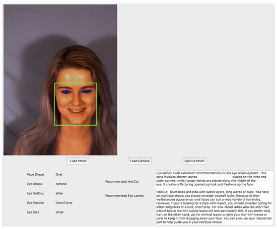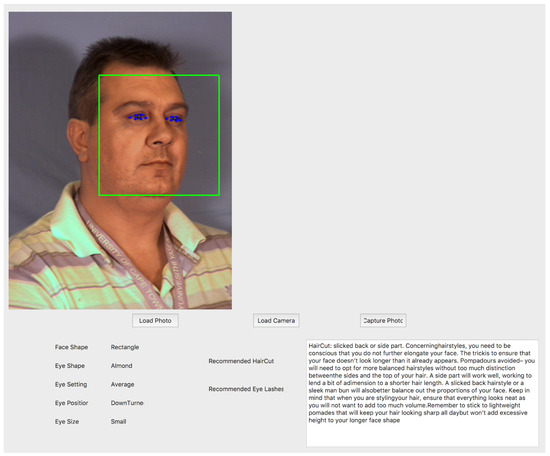 Figure 9 and Figure 10 present the graphical user interface (GUI) of the developed system showing an input image (man and woman) with the automatically detected landmarks, automatically extracted facial/eye attributes and the recommended haircut and eyelash extension.