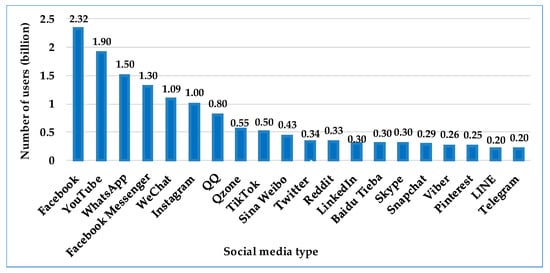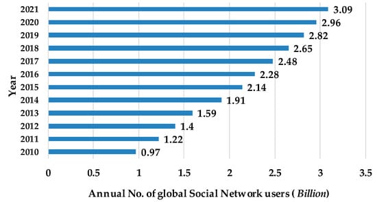 Social media (SM) applications have gained significant attention in academia and practice; according to the annual reports of social media management platforms, social media and mobile apps achieved significant growth in usage in 2018. Throughout the Middle East, about 250 million people use 304.5 million mobile phones [1]. Social media has increasingly become a necessary tool for maintaining connections and transferring experiences globally. Emmert-Streib and Matthias examined incorporating big social data with social networks that needed to build accurate prediction models [2]. Emmert-Streib et al. described the importance of data from social media in a general context, which provides excellent opportunities for extensive mining amounts of text, image, and video-based data [3]. Statista has reported a steady increase in social media usage globally [4] and has recorded 2.82 billion users worldwide, which is expected to increase to 3.09 billion users, as shown in Figure 1.