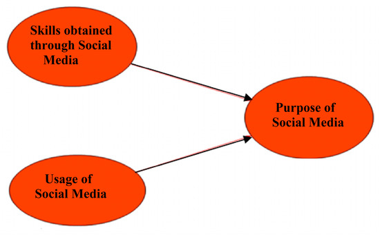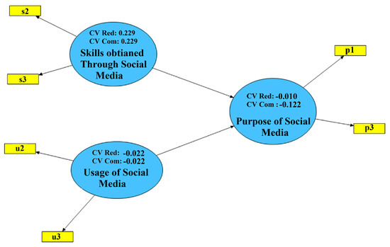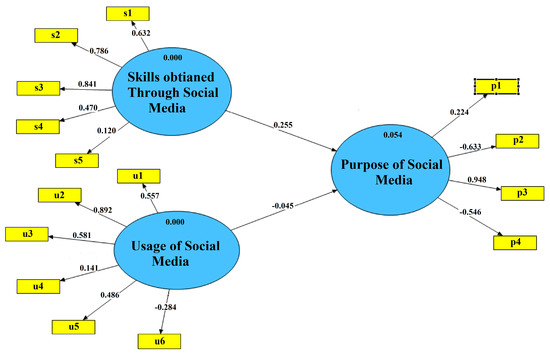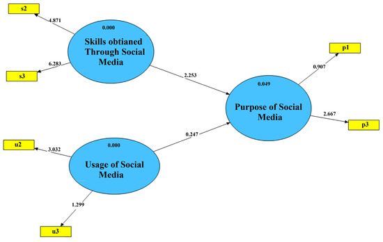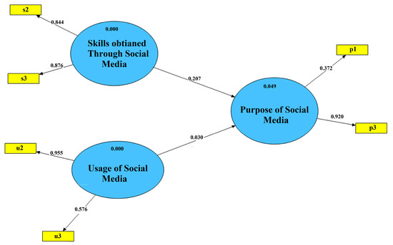 The relationships were shown among the skills obtained through social media, the usage of social media, and the purpose of social media. The reliability of the model was tested based on validating the discriminant and convergent results [38]. Figure 4 shows the initial path model coefficients and the values of the variables (the skills obtained through social media, the usage of social media, and the purpose of social media).
