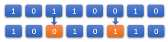 Bit sequence mutation example, where the 3rd and 6th features are switched (mutated).