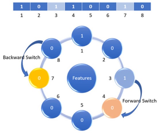 Essentially, the MNM considers two contiguous techniques of the switched feature. First, in the forward switched technique, the right feature is mutated, and then fitness values for the two solutions (the best solution with the current switched solution) are evaluated. Second, in the backward switched technique, the same technique is applied but the left feature is mutated. Consequently, two solutions are created, and the best value is ranked as the best solution. Furthermore, the MNM circle is used, as the last feature is connected to the first feature to have two contiguous neighbors on both sides. Figure 2 explains the technique of the MNM circle.