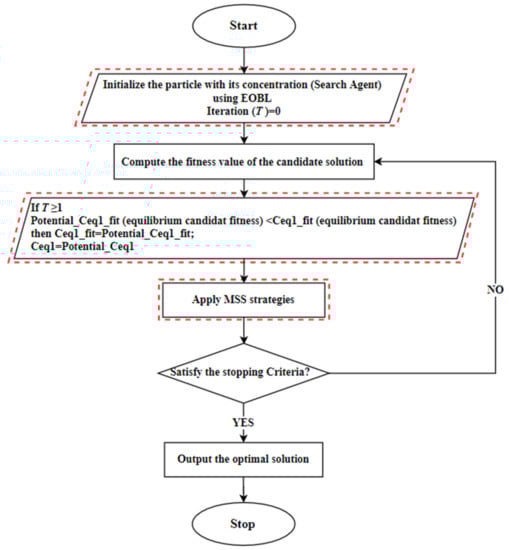The EOA employs various search mechanisms including both exploratory and exploitative ones to randomly change the solutions. The search agents represent the particles with their concentrations, and the optimal results represent the equilibrium state. The concentrations are randomly updated, considering the best-so-far solutions, called equilibrium candidates. This random updating, along with an accurate generation rate value, enhances EOA’s exploratory behavior in the initial iterations and the exploitative search in the final iterations, avoiding the search being trapped in local optima. In addition, balancing exploration and exploitation provides an adaptive value for the control parameter, and thus will reduce the magnitude of the motions of the particles. EOA depends on G to move from exploration to exploitation and to select the current exploitation method. Additionally, G is used to avoid the particles becoming trapped in local optima. However, G might quickly change its convergence speed towards the optimal solution, which may cause the particles to fall to a local optimum problem. []. In this subsection, we explain the proposed three MSS that enhance both the global and local search in the EOA algorithm, and help avoid being stuck in local optima, to some extent.