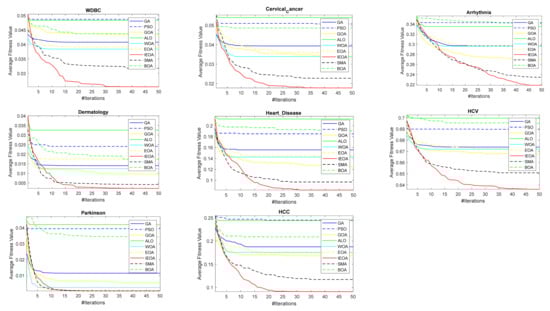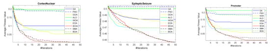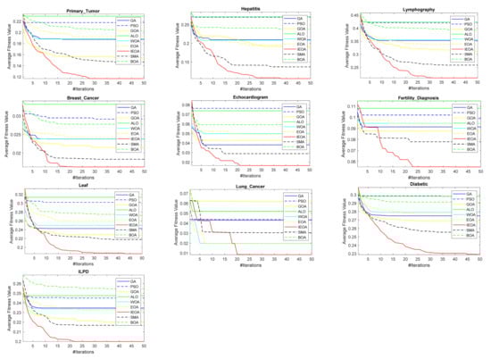 Furthermore, the MNM strategy improved the local search of the IEOA by mining the promising area and exploring for a superior solution. Figure 4 and Figure 5 display graphical representations of the convergence curves. The convergences curves also need to be considered to evaluate the convergence speed of IEOA and the other optimization algorithms. In cases where the optimization algorithm cannot balance the exploration and exploitation in all iterations, it likely to converge to the local optimum. It can be observed from the convergence-curve results that IEOA accomplished a superior speed to all other algorithms, which implies the superiority of IEOA in processing different dimension datasets. Moreover, the effectiveness of the proposed MSS search strategies was notable, switching from exploration to exploitation search in the midpoint of iterations (from iteration 25 to the maximum iteration 50), and increasing the convergence speed in all cases. A brief comparison of IEOA with the other algorithms by calculating the average classification accuracy, selected features, and fitness value for all experiments is shown in Table 9.