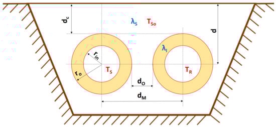 Scheme of two underground district heating pipes. Definitions are based on Nussbaumer et al. [].