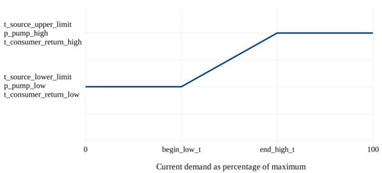 Pump pressure, heat-source temperature, and consumer return temperature set in respect to ratio of system’s current heat demand and maximal heat demand in one frame. Parameters can be set in settings.csv.
