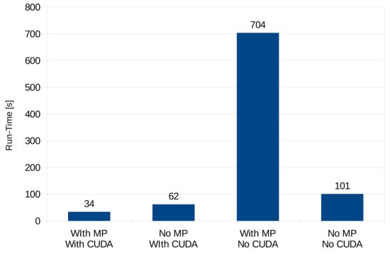 When the calculation process is started, a simulation object and a network object are generated for every simulation setting, so a parallel run is possible without the runs interfering each other. In order to make use of that fact, multiprocessing capability was implemented that starts a unique process for every simulation setting. While the Python GIL Lock would prevent the script from running multiple threads at a time when using multithreading, multiprocessing allows for this by distributing over multiple Python interpreter processes. However, this feature can be disabled. Depending on the number of CPU cores, some simulation objects run in parallel, while others are queued. All TESPy connections in DiGriPy are limited to a liquid state, and CoolProp, which is the library used by TESPy as a back end for fluid-property calculations, is set to use a tabular-interpolation method rather than to compute the full equations of state. In TESPy, a flag was implemented that moves matrix inversions to the GPU, which were found to be the most expensive functions in the considered cases. This requires the GPU to support Compute Unified Device Architecture (CUDA), an Nvidia-developed platform for running general-purpose code on GPUs, and the cupy package to be installed. All these measures add up to a massive performance improvement, as Figure 3 shows. In that example, in each test, three simulation settings were run with multiprocessing turned on and paralleled into three individual processes. While turning both CUDA calculation and multiprocessing on improved performance by a factor of 3, only turning multiprocessing on had a massive negative effect on performance. The reason for that seemed to be that Numpy internally uses multiple CPU cores; thus, running multiple processes whiel simultaneously using Numpy produces a large overhead and can worsen overall performance, as CPU resource distribution inside Numpy becomes a bottleneck. When running matrix inversion on the GPU, this problem does not occur. Calculations were performed on a i7-4710MQ CPU with 16 GB RAM and a Nvidia GeForce 840M with 2 GB running Manjaro Linux with kernel version 5.10.