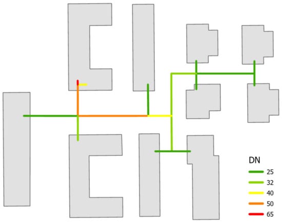 The tool has a library for geometric values of common district heat pipes, for example, plastic jacket pipes (PJP), distinguished according to insulation level and nominal diameter (DN). PJP1 and PJP3 thus refer to pipes of the type PJP with an insulation level of 1 and 3, respectively. For each pipe type, geometric values are sorted by DN. The library can easily be expanded if other pipes are used and if the needed values are known. Values in the library are based on the product information of district pipes from pipe manufacturers and are given in Nussbaumer et al. []. Therefore, a necessary input when using the tool is the definition of the pipe type, which then leads to a set of parameters of the pipe radii and insulation thickness. The equations for the heat flux of district heating pipes (Equations (1)–(4)) were implemented in DiGriPy. Other equations for solving a pipe system, for example, the equations for pressure loss and mass-flow distribution, are available in TESPy [] and are used within DiGriPy. The equations of state are solved for the fluid at each defined element of the heating grid. The calculation of heat losses was implemented as a postprocessing step in the pipe elements by multiplying the loss of enthalpy with the mass flow.