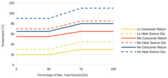 A testing network was created and is described in Table A1 and Figure 4. It consisted of 1 heat source, 10 consumers, 18 pipe sections, each consisting of a supply and a return pipe, and the resulting splitters, mergers, and valves, resulting in a total of 73 components, 82 connections, and 365 equations. For this, a low-, mid-, and high-temperature project folder was created, for each of which a slightly adapted time series file is given, providing synthetic but plausible consumer demand data for a 1 year time range divided into 1 hour frames (see Table A3 for an example showing the demand of the high-temperature test case and Appendix B for further information). Below, Lo, Mo, and Ho stand for low-, medium-, and high-temperature levels set as shown in Figure 5. For each, numbers from 1 to 3 indicate insulation strength, with three settings per temperature level. Each of these nine settings was set in the settings.csv files (see Table A2). Results are compared with the validation calculations from Section 2.
