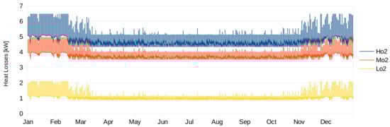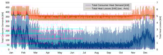 Figure 6 and Figure 7 show the consumer demands and resulting network heat losses for the 1 year time series and in a 4 day extract. Heat losses of the network sensibly followed the consumers’ demands, where peaks in demand led to peaks in the losses graph, while losses did not fall under a certain value, which was about 4.3 kW in the high-temperature case. Even when consumer demand of zero was defined in the time series, there was mass flow in all pipes, and system ensured that the consumer return temperature was guaranteed. As this was C while the heat-source supply temperature was C in the plotted high-temperature test case, losses were still quite high despite a minimal demand of 100 W. Mass flow is determined depending on the guaranteed temperature at the heat exchangers of the consumers and their heat demand. However, since the mass of water in the system is constant, heat losses cannot become zero given the temperature difference between water in the pipe and ground temperature. The comparison of the test-case results for different temperature levels is displayed in Figure 8, clearly showing this correlation.