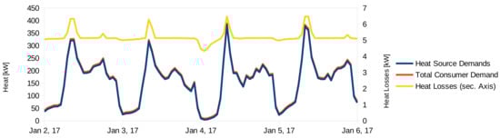 Heat-source demand results and total consumer demands in high-temperature test case—January days. Heat losses on secondary axis.