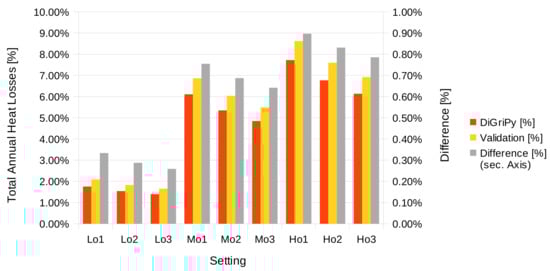Comparison of DiGriPy heat losses as fraction of total heat-source demands with results of validation calculations as explained in Section 2. Difference in results is plotted against the secondary axis.