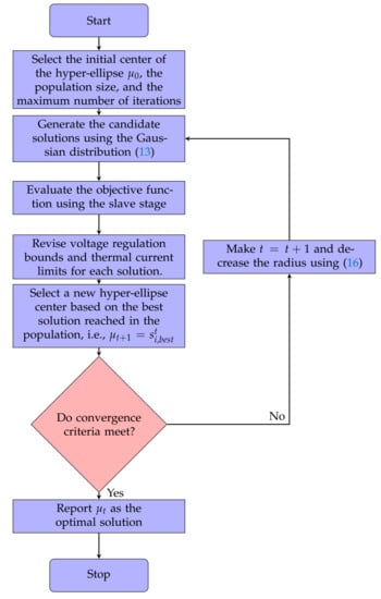 where is a vector with dimension d filled by random values, represents the center of the hyper-ellipse at the iteration t, and is the matrix of co-variances. This matrix is simplified as recommended in [] by a matrix with identical values in its diagonal and null values outside its diagonal. The value of can be determined as follows: