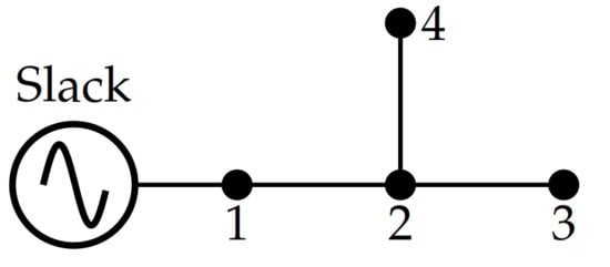 In general, the three-phase power flow problem in electrical distribution networks is addressed using numerical methods (iterative procedures) due to the nonlinear non-convex structure of the power balance Equations (4) and (5). Therefore, in this section, the general implementation of three-phase backward/forward power flow is illustrated for distribution networks based on its matricial formulation using a small test feeder example, as presented in []. To implement the backward/forward power-flow method, consider the electrical distribution network presented in Figure 2. In addition, for this test feeder, we consider the demand information reported in Table 2, and a unique impendance matrix defined in (17) for all lines.