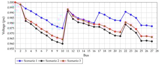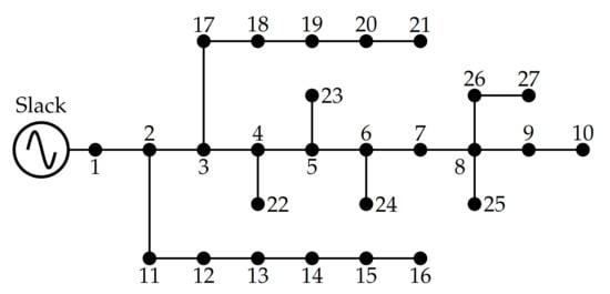 This test feeder corresponds to a three-phase network comprising 27 nodes (1 slack and 26 demands), which work with 13.8 kV at the substation node. This test system was reported in [] to analyze the problem of the optimal conductor size selection using the tabu search algorithm. The single-phase diagram of this 27-bus system is depicted in Figure 5.