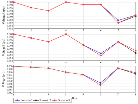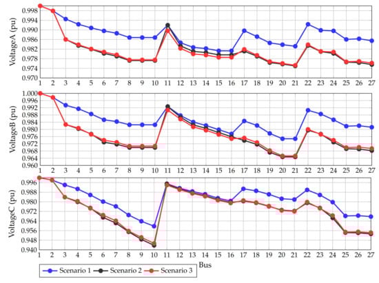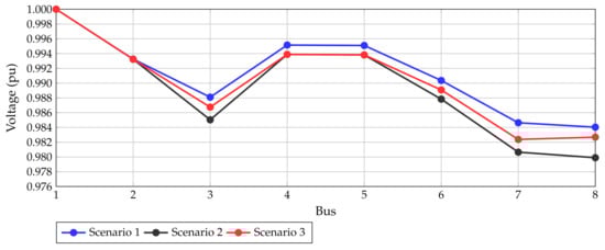 In this simulation case, it is considered that the test feeders composed of 8 and 27 nodes work with loads perfectly balanced. In addition, the information reported in Table 6 and Table 7 correspond to the load per phase, and the nominal voltage is defined phase-to-ground.