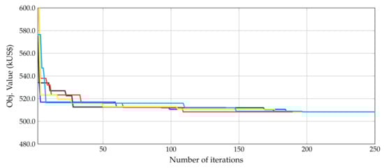 This graphic shows that after 200 iterations, DVSA finds an objective function that is stabilized at the final value, which was proved with 5 different consecutive simulations. This behavior of the objective function value confirms the effectiveness and robustness of the DVSA to solve complex problems with discrete variables using hyper-spheres to explore and exploit the solution space considering a variable radius to balance the exploration and exploitation stages.