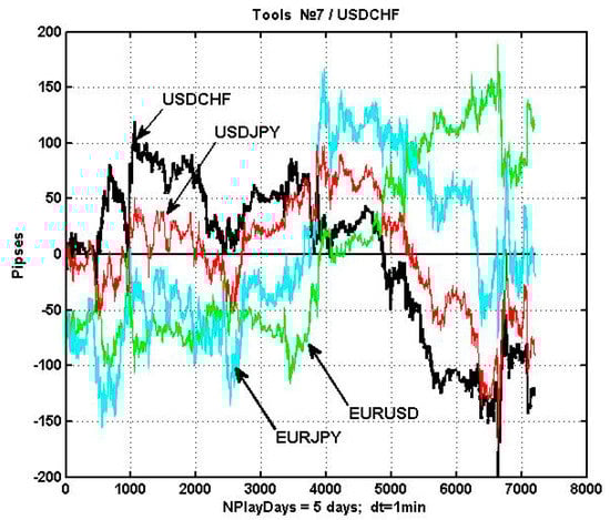 An example of process shown by the USDCHF, EURUSD, EURJPY, and USDJPY quotations on a five-day observation interval with equidistanced counts dt = 1min can be seen in Figure 1.