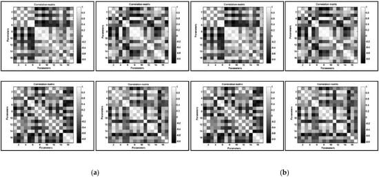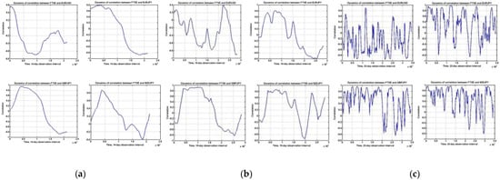 The correlations between the currency pairs from Table 1 and the FTSE and DJ indexes are presented as tonal matrices in Figure 2a,b. The estimates were performed using the time intervals drawn from Table 2.