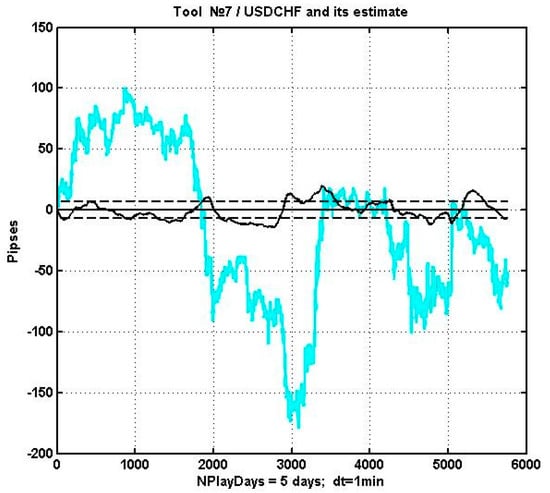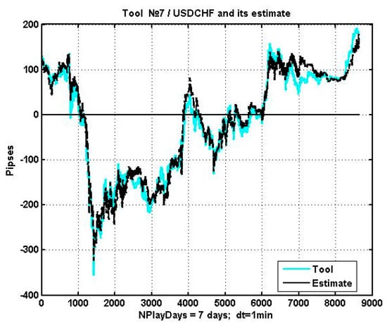 As an illustration, Figure 4 contains the observation plots of USDCHF in a seven-day period with an observation interval of 1 min, as well as its regression forecast constructed with the use of correlated quotations of EURUSD, EURJPY, and USDJPY.