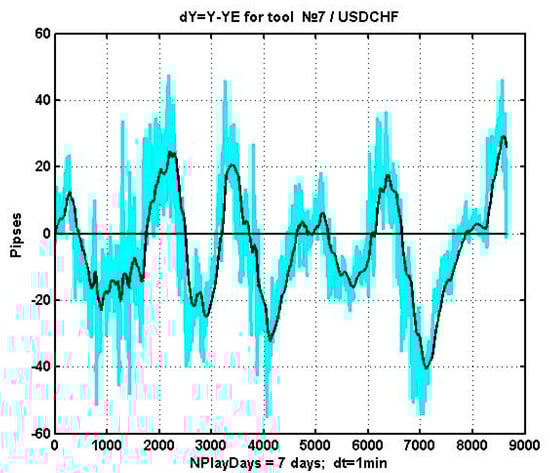 Figure 5 presents the difference between the quotations of USDCHF and their regression estimates, as well as the smoothed version, obtained via applying an exponential filter with a transfer coefficient of .