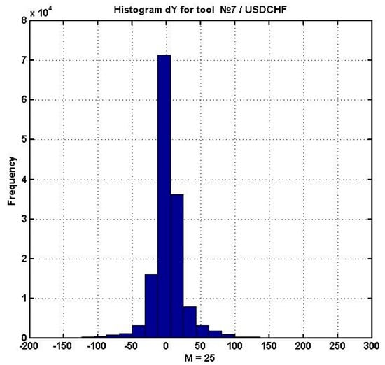 It can be easily seen that the systemic component is an oscillatory nonperiodic process with a large number of local trends. In the general theory of dynamic processes, such observations are classified as chaotic [,,,]. The noise is a nonstationary process roughly described by the Gaussian model with changing parameters. A more detailed justification of this model can be found in [,,].