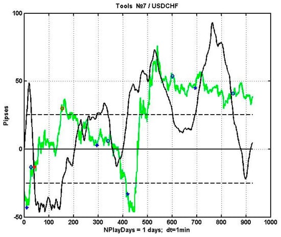 Stars on line and denote the moments of crossing the levels, i.e., position opening. Positions were closed at the moments corresponding to the reverse crossing of levels by . The graph denotes these moments either with diamonds (profit gain) or circles (profit loss). It can be seen that the result is not clear-cut: it is rather probabilistic. The provided example has benefitted from our evolutionally adapted regression algorithm by obtaining 140 pipses of profit in a single day.