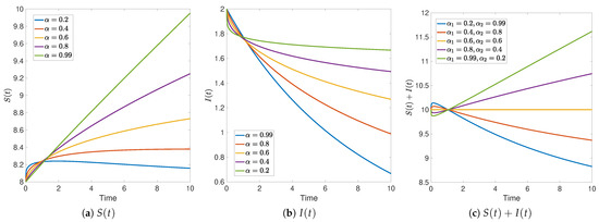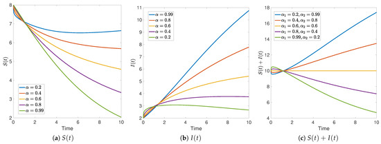 We show the evolution in time of , and their sum as changes: in Figure 1 we considered a case with and in Figure 2 with . Note in plots (a) and (b) that the steepness of the solutions and in the long run are related to the size of and , respectively: this can be interpreted as a memory effect of the Caputo fractional operator [21]. An interesting phenomenon is also the lack of monotonicity of the solutions, in contrast with ordinary SIS models.