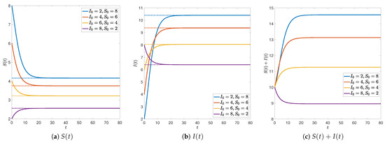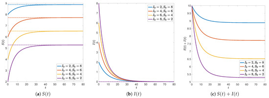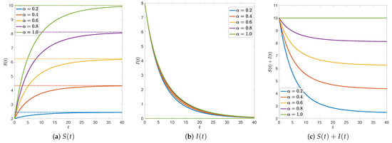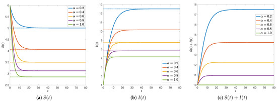 In Figure 3 and Figure 4 we show the results obtained as changes in . The parameters , , and are the same in all simulations, fixed as , , and . The parameter , instead, is set to in Figure 3, which implies , while in Figure 4, and thus . The dashed lines represent the equilibria estimated in Proposition 1. Both S and I monotonically converge to their equilibria. Note that the time delay induced by the fractional order emerges in the fact that the smallest is , the slowest is the convergence of the related solutions to equilibria. Finally, remark that, for , the sum is constant, since (2) coincides with the classical SIS model, while if , then the monotonicity of is in agreement with Theorem 2.