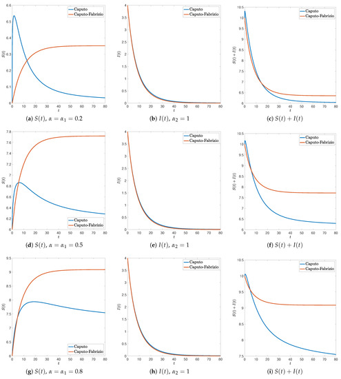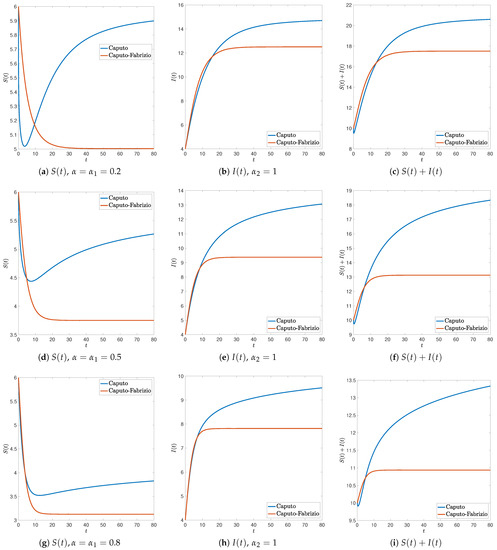 We conclude this section with some tests pointing out the effect of the choice of a particular fractional operator on SIS models. We directly compare the numerical solution to the system with Caputo fractional SIS model (1) and Caputo–Fabrizio fractional SIS model (2). To this end, we fix the initial data and . We consider the set the fractional orders and in (1), the fractional order in (2), and we set , , letting vary in the set . Figure 7 depicts the results in a case with , in particular and , whereas in Figure 8, we test a case with , in particular and . Note that the evolution of susceptible population is mostly affected by the change of differential operator, and this effect is augmented by choosing small fractional orders. Finally, note that the Caputo–Fabrizio operator preserves the monotonicity properties of the ordinary SIS case, while the Caputo operator used in (1) yields a more complex structure.