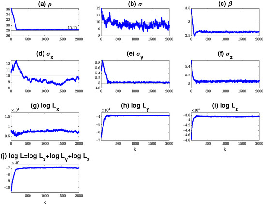 Trace plots of the estimated parameters in the noisy Lorenz 63 model. (a–f) the trace plots of each individual parameters , and . For reference, the true parameters are shown by the black solid lines; (g) the trace plot of the log-likelihood for the hidden path of x, according to (6); (h–i) the trace plots of the log-likelihood of the observation of y and z, respectively, according to (5); (j) the trace plots of the total log-likelihood.